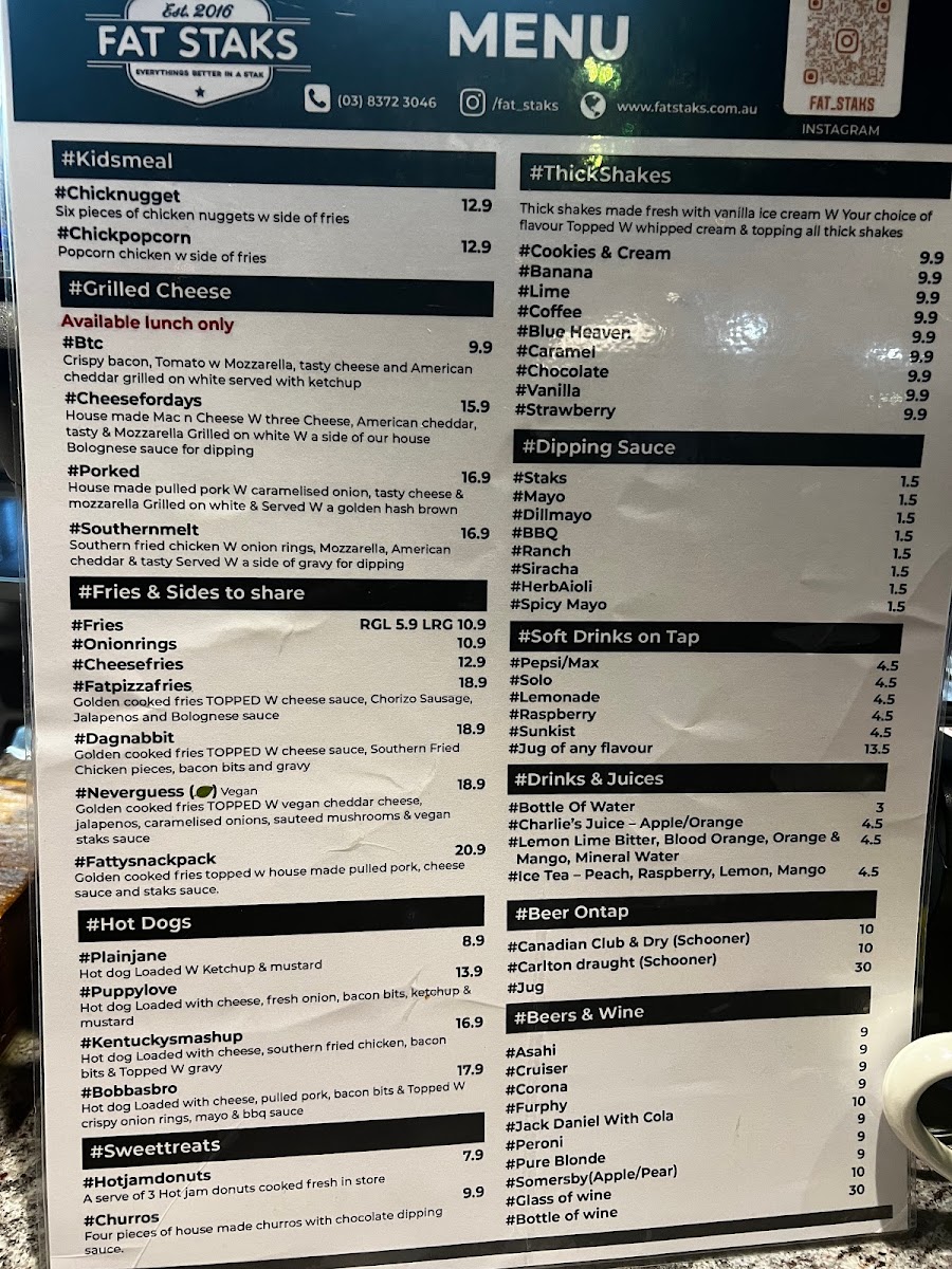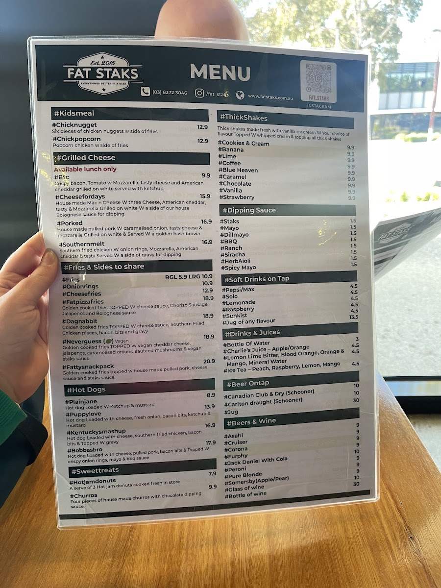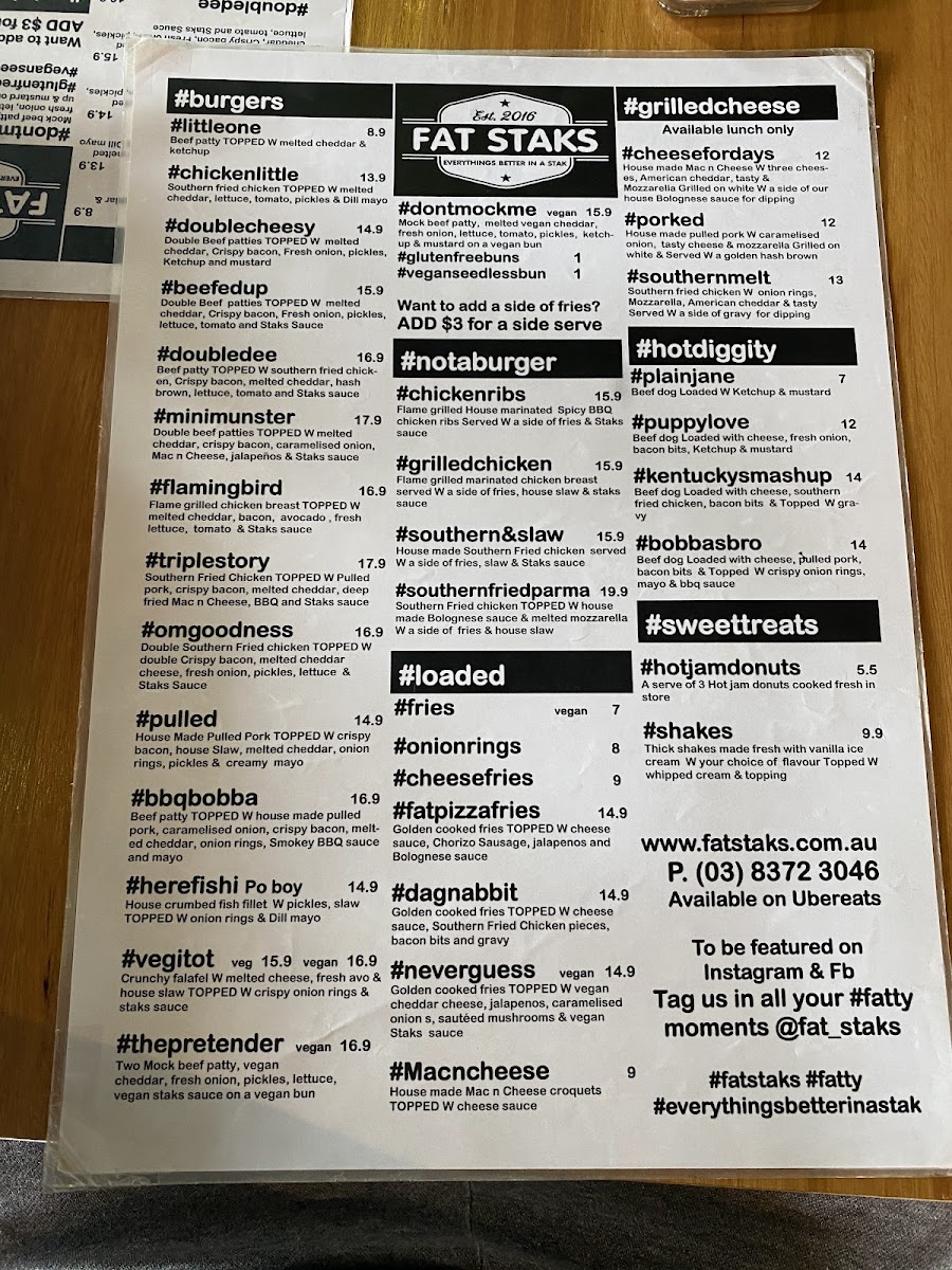Welcome to Fat Staks, your go-to destination for indulgent comfort food in Bundoora, Victoria. The menu is creatively crafted, showcasing a range of delicious offerings that cater to all cravings. Notable highlights include the Fatty Finger Box, a beloved fan-favorite reminiscent of Raising Cane's, featuring crispy chicken tenders paired with addictive dipping sauce. For those with a penchant for fries, the Fatty Snackpack with pulled pork and cheese sauce is an explosion of flavor.